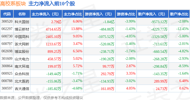 从资金流向上来看,当日高校系板块主力资金净流入1.3亿元,游资资金净流入5267.4万元,散户资金净流出1.83亿元。高校系板块个股资金流向见下表: