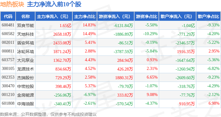 从资金流向上来看,当日地热板块主力资金净流出1.09亿元,游资资金净流出2738.18万元,散户资金净流入1.37亿元。地热板块个股资金流向见下表:
