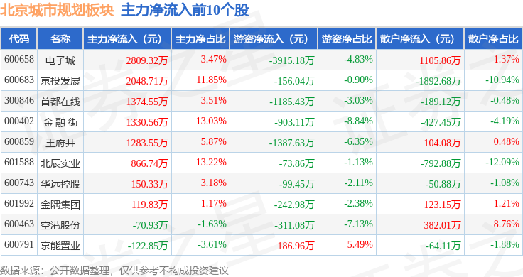 从资金流向上来看,当日北京城市规划板块主力资金净流出3.05亿元,游资资金净流出6689.99万元,散户资金净流入3.72亿元。北京城市规划板块个股资金流向见下表: