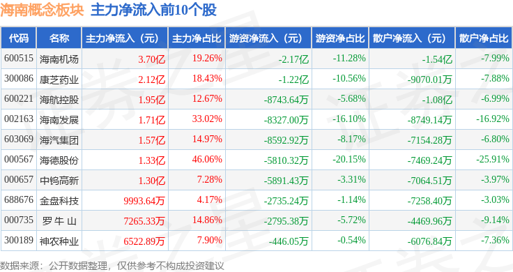 从资金流向上来看,当日海南概念板块主力资金净流入17.47亿元,游资资金净流出7.23亿元,散户资金净流出10.24亿元。海南概念板块个股资金流向见下表: