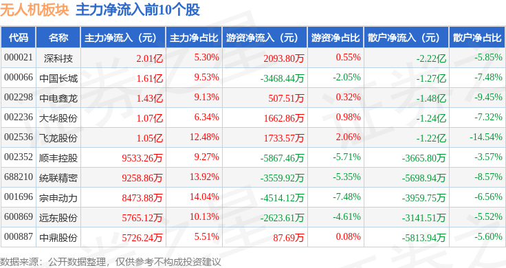 从资金流向上来看,当日无人机板块主力资金净流出15.22亿元,游资资金净流入2.08亿元,散户资金净流入13.14亿元。无人机板块个股资金流向见下表:
