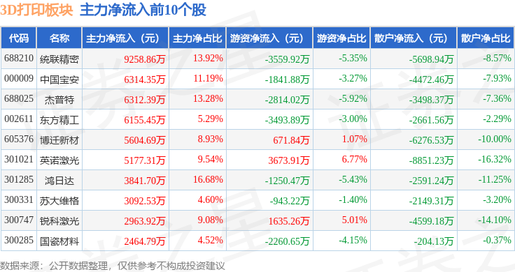 从资金流向上来看,当日3D打印板块主力资金净流出7.47亿元,游资资金净流入1.63亿元,散户资金净流入5.85亿元。3D打印板块个股资金流向见下表: