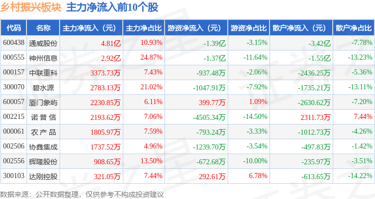 从资金流向上来看,当日乡村振兴板块主力资金净流入4.26亿元,游资资金净流出4.64亿元,散户资金净流入3729.05万元。乡村振兴板块个股资金流向见下表: