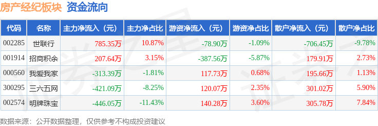 从资金流向上来看,当日房产经纪板块主力资金净流出187.54万元,游资资金净流出88.37万元,散户资金净流入275.92万元。房产经纪板块个股资金流向见下表: