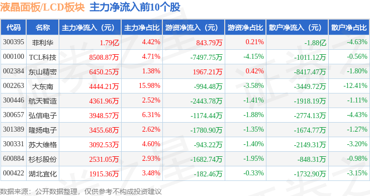 从资金流向上来看,当日液晶面板/LCD板块主力资金净流出11.93亿元,游资资金净流入2.16亿元,散户资金净流入9.77亿元。液晶面板/LCD板块个股资金流向见下表: