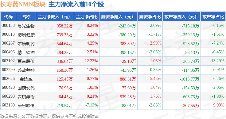 从资金流向上来看,当日长寿药NMN板块主力资金净流出1.88亿元,游资资金净流入1583.35万元,散户资金净流入1.72亿元。长寿药NMN板块个股资金流向见下表: