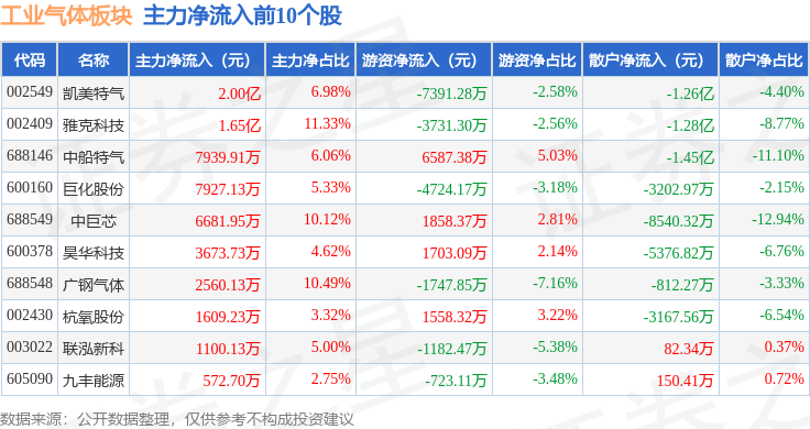 从资金流向上来看,当日工业气体板块主力资金净流入3.64亿元,游资资金净流入835.92万元,散户资金净流出3.72亿元。工业气体板块个股资金流向见下表: