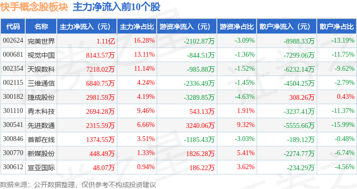 从资金流向上来看,当日快手概念股板块主力资金净流出5.56亿元,游资资金净流入7882.05万元,散户资金净流入4.77亿元。快手概念股板块个股资金流向见下表: