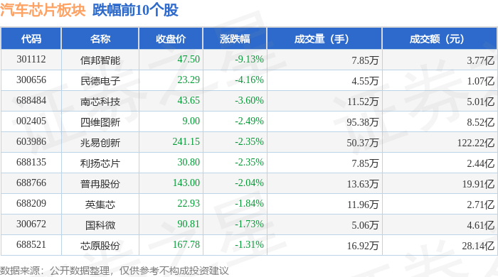 证券之星消息,10月29日汽车芯片板块较上一交易日下跌0.18%,信邦智能领跌。当日上证指数报收于4016.33,上涨0.7%。深证成指报收于13691.38,上涨1.95%。汽车芯片板块个股涨跌见下表: