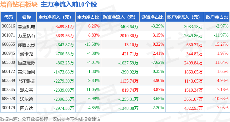 从资金流向上来看,当日培育钻石板块主力资金净流出8.19亿元,游资资金净流入1.11亿元,散户资金净流入7.08亿元。培育钻石板块个股资金流向见下表: