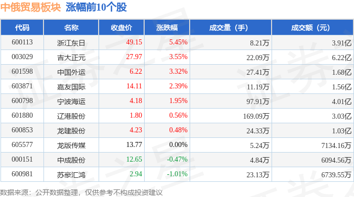 证券之星消息,10月29日中俄贸易板块较上一交易日上涨1.07%,浙江东日领涨。当日上证指数报收于4016.33,上涨0.7%。深证成指报收于13691.38,上涨1.95%。中俄贸易板块个股涨跌见下表: