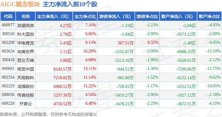 从资金流向上来看,当日AIGC概念板块主力资金净流出7.03亿元,游资资金净流入8171.87万元,散户资金净流入6.21亿元。AIGC概念板块个股资金流向见下表: