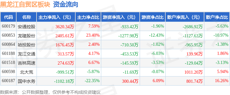 从资金流向上来看,当日黑龙江自贸区板块主力资金净流入6188.9万元,游资资金净流出3232.27万元,散户资金净流出2956.63万元。黑龙江自贸区板块个股资金流向见下表: