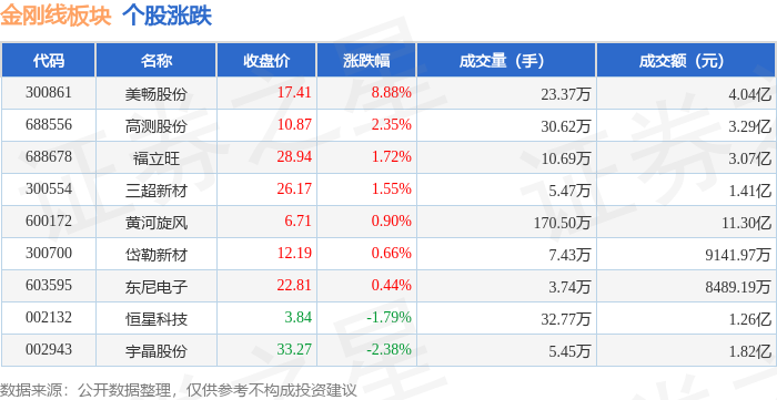 证券之星消息,10月29日金刚线板块较上一交易日上涨1.7%,美畅股份领涨。当日上证指数报收于4016.33,上涨0.7%。深证成指报收于13691.38,上涨1.95%。金刚线板块个股涨跌见下表: