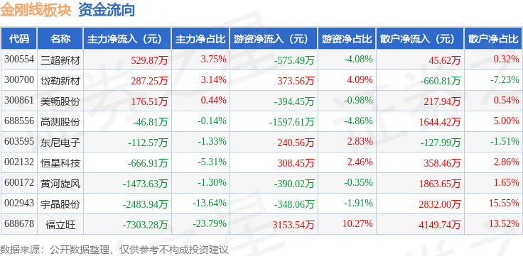 从资金流向上来看,当日金刚线板块主力资金净流出1.11亿元,游资资金净流入770.47万元,散户资金净流入1.03亿元。金刚线板块个股资金流向见下表: