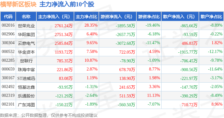 从资金流向上来看,当日横琴新区板块主力资金净流出1.14亿元,游资资金净流出4663.88万元,散户资金净流入1.61亿元。横琴新区板块个股资金流向见下表: