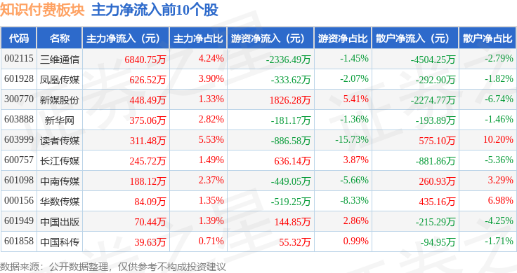 从资金流向上来看,当日知识付费板块主力资金净流出3.11亿元,游资资金净流出100.57万元,散户资金净流入3.12亿元。知识付费板块个股资金流向见下表: