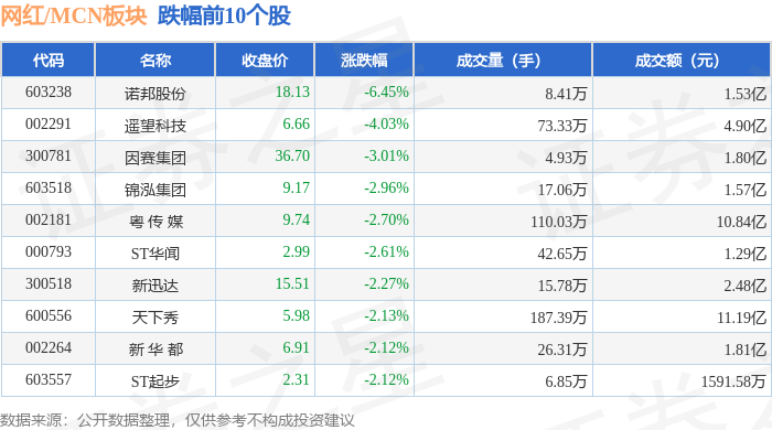 从资金流向上来看,当日网红/MCN板块主力资金净流出13.64亿元,游资资金净流入1.53亿元,散户资金净流入12.1亿元。网红/MCN板块个股资金流向见下表: