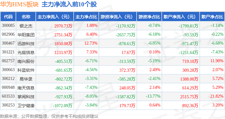 从资金流向上来看,当日华为HMS板块主力资金净流出7.93亿元,游资资金净流入4.0亿元,散户资金净流入3.93亿元。华为HMS板块个股资金流向见下表: