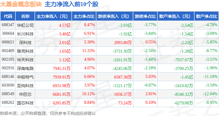 从资金流向上来看,当日大基金概念板块主力资金净流出19.52亿元,游资资金净流入13.88亿元,散户资金净流入5.63亿元。大基金概念板块个股资金流向见下表: