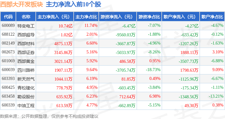 从资金流向上来看,当日西部大开发板块主力资金净流入7.91亿元,游资资金净流出8.68亿元,散户资金净流入7679.06万元。西部大开发板块个股资金流向见下表: