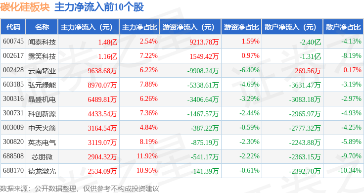 从资金流向上来看,当日碳化硅板块主力资金净流出8.29亿元,游资资金净流入5.35亿元,散户资金净流入2.94亿元。碳化硅板块个股资金流向见下表: