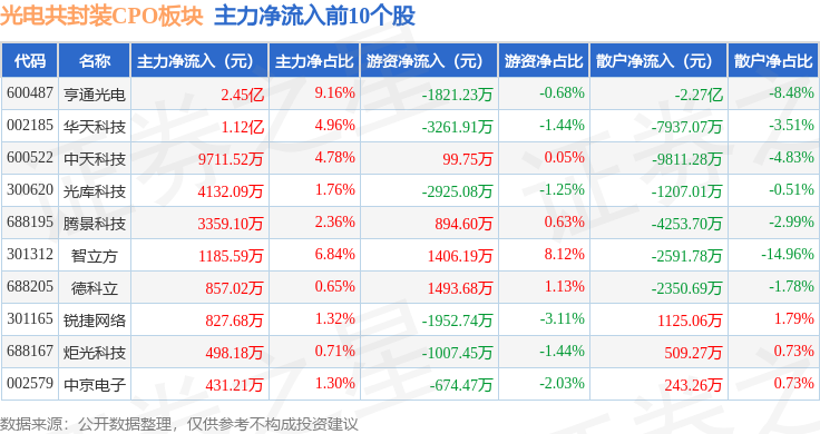 从资金流向上来看,当日光电共封装CPO板块主力资金净流出45.85亿元,游资资金净流入28.92亿元,散户资金净流入16.93亿元。光电共封装CPO板块个股资金流向见下表: