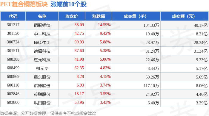 证券之星消息,10月29日PET复合铜箔板块较上一交易日上涨1.72%,铜冠铜箔领涨。当日上证指数报收于4016.33,上涨0.7%。深证成指报收于13691.38,上涨1.95%。PET复合铜箔板块个股涨跌见下表: