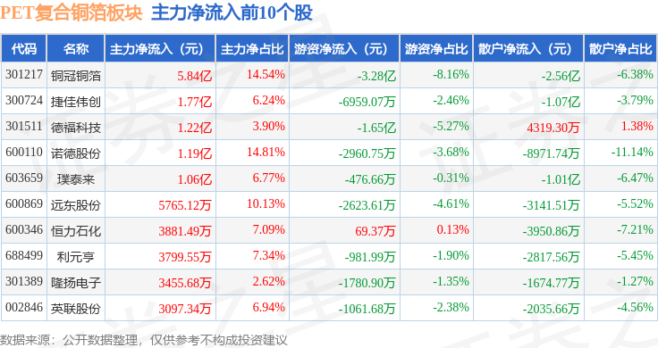 从资金流向上来看,当日PET复合铜箔板块主力资金净流入5.95亿元,游资资金净流出1.76亿元,散户资金净流出4.18亿元。PET复合铜箔板块个股资金流向见下表: