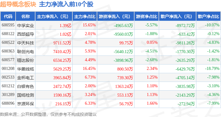 从资金流向上来看,当日超导概念板块主力资金净流出1.18亿元,游资资金净流出3577.58万元,散户资金净流入1.54亿元。超导概念板块个股资金流向见下表: