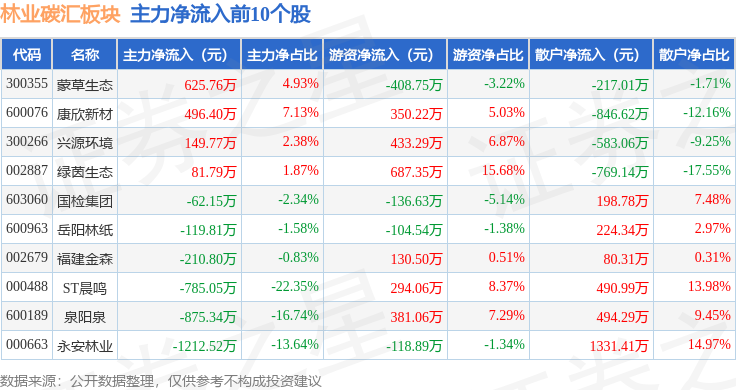 从资金流向上来看,当日林业碳汇板块主力资金净流出3485.58万元,游资资金净流入1670.16万元,散户资金净流入1815.42万元。林业碳汇板块个股资金流向见下表: