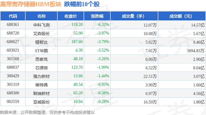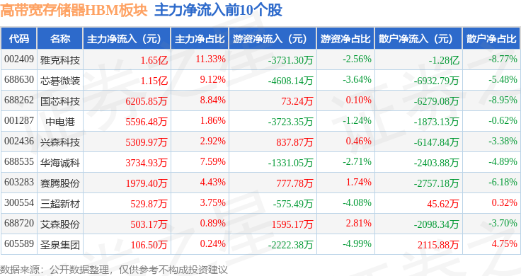 从资金流向上来看,当日高带宽存储器HBM板块主力资金净流出12.07亿元,游资资金净流入4.26亿元,散户资金净流入7.81亿元。高带宽存储器HBM板块个股资金流向见下表:
