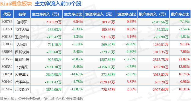 从资金流向上来看,当日Kimi概念板块主力资金净流出8.99亿元,游资资金净流入4.0亿元,散户资金净流入4.99亿元。Kimi概念板块个股资金流向见下表: