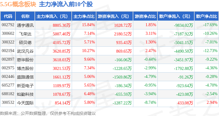 从资金流向上来看,当日5.5G概念板块主力资金净流出15.07亿元,游资资金净流入8.55亿元,散户资金净流入6.52亿元。5.5G概念板块个股资金流向见下表: