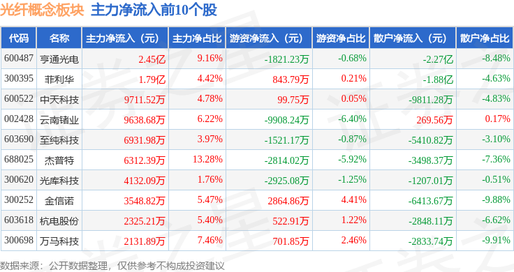 从资金流向上来看,当日光纤概念板块主力资金净流入3.83亿元,游资资金净流出9401.3万元,散户资金净流出2.89亿元。光纤概念板块个股资金流向见下表: