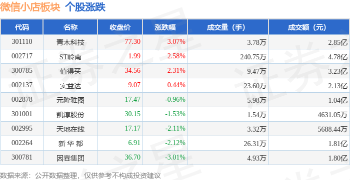 证券之星消息,10月29日微信小店板块较上一交易日上涨0.0%,青木科技领涨。当日上证指数报收于4016.33,上涨0.7%。深证成指报收于13691.38,上涨1.95%。微信小店板块个股涨跌见下表: