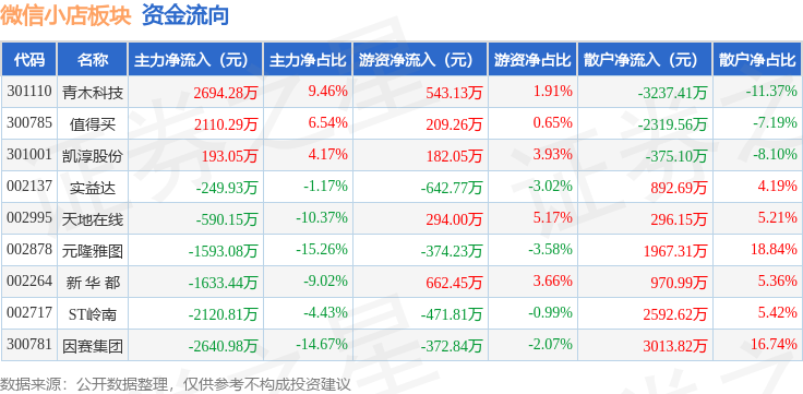 从资金流向上来看,当日微信小店板块主力资金净流出3830.76万元,游资资金净流入29.25万元,散户资金净流入3801.51万元。微信小店板块个股资金流向见下表: