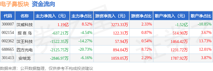 从资金流向上来看,当日电子鼻板块主力资金净流入4810.78万元,游资资金净流入5406.65万元,散户资金净流出1.02亿元。电子鼻板块个股资金流向见下表:
