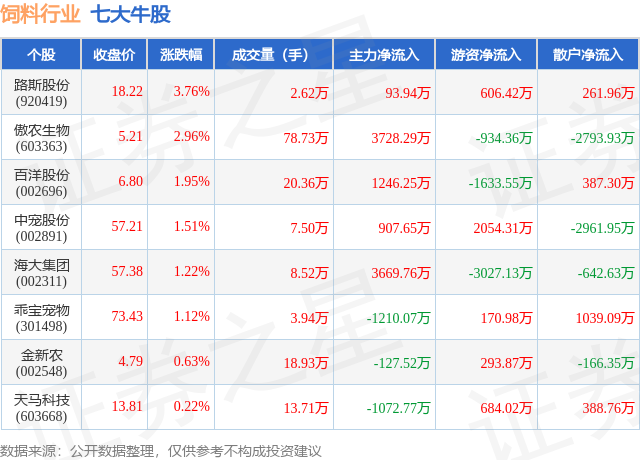 个股表现方面,饲料行业当日领涨股为路斯股份(920419),该股当日报收18.22,上涨3.76%,成交量2.62万,主力资金净流入93.94万元。傲农生物(603363)以上涨2.96%紧随其后,该股当日成交量78.73万,主力资金净流入3728.29万元。除此之外,百洋股份(002696)、中宠股份(002891)、海大集团(002311)均进入当日牛股之列。具体个股列表见下表: