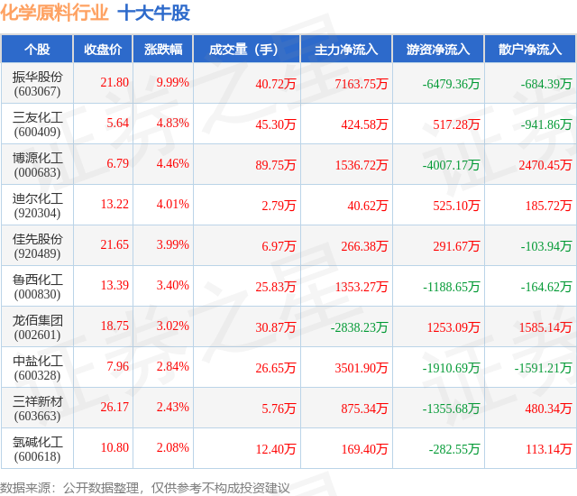 个股表现方面,化学原料行业当日领涨股为振华股份(603067),该股当日报收21.8,上涨9.99%,成交量40.72万,主力资金净流入7163.75万元。三友化工(600409)以上涨4.83%紧随其后,该股当日成交量45.3万,主力资金净流入424.58万元。除此之外,博源化工(000683)、迪尔化工(920304)、佳先股份(920489)均进入当日牛股之列。具体个股列表见下表: