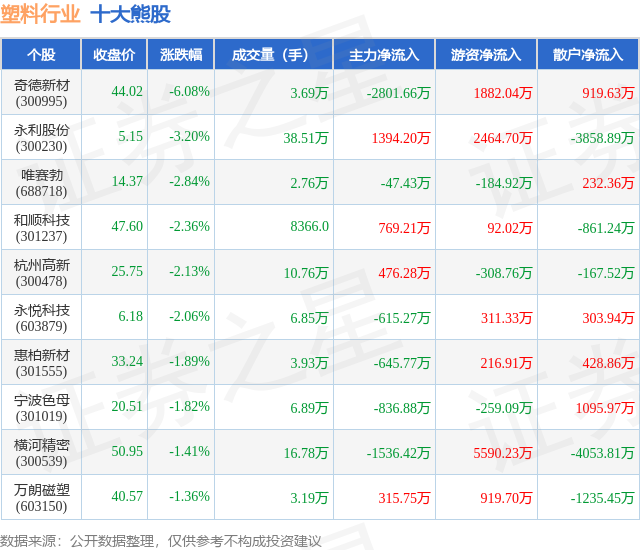 个股表现方面,塑料行业当日领跌股为奇德新材(300995),该股当日报收44.02,下跌6.08%,成交量3.69万,主力资金净流出2801.66万元。永利股份(300230)以下跌3.2%紧随其后,该股当日成交量38.51万,主力资金净流入1394.2万元。除此之外,唯赛勃(688718)、和顺科技(301237)、杭州高新(300478)均进入当日熊股之列。具体个股列表见下表: