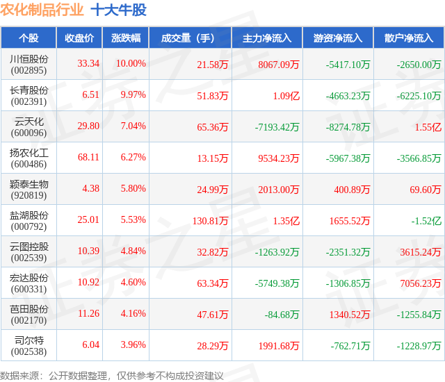 个股表现方面,农化制品行业当日领涨股为川恒股份(002895),该股当日报收33.34,上涨10.0%,成交量21.58万,主力资金净流入8067.09万元。长青股份(002391)以上涨9.97%紧随其后,该股当日成交量51.83万,主力资金净流入1.09亿元。除此之外,云天化(600096)、扬农化工(600486)、颖泰生物(920819)均进入当日牛股之列。具体个股列表见下表:
