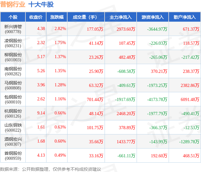 个股表现方面,普钢行业当日领涨股为新兴铸管(000778),该股当日报收4.38,上涨2.82%,成交量177.05万,主力资金净流入2973.6万元。凌钢股份(600231)以上涨1.75%紧随其后,该股当日成交量41.14万,主力资金净流入107.45万元。除此之外,柳钢股份(601003)、南钢股份(600282)、马钢股份(600808)均进入当日牛股之列。具体个股列表见下表: