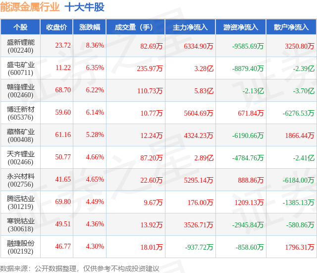 个股表现方面,能源金属行业当日领涨股为盛新锂能(002240),该股当日报收23.72,上涨8.36%,成交量82.69万,主力资金净流入6334.9万元。盛屯矿业(600711)以上涨6.35%紧随其后,该股当日成交量235.97万,主力资金净流入3.28亿元。除此之外,赣锋锂业(002460)、博迁新材(605376)、藏格矿业(000408)均进入当日牛股之列。具体个股列表见下表: