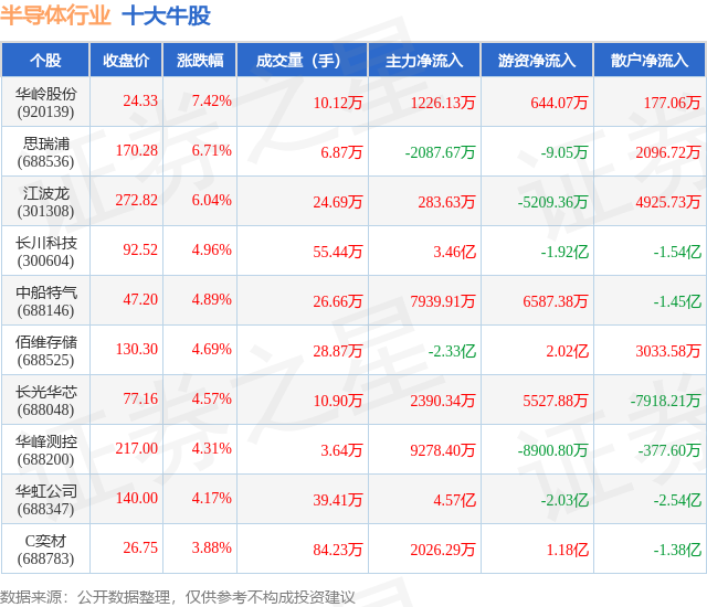 个股表现方面,半导体行业当日领涨股为华岭股份(920139),该股当日报收24.33,上涨7.42%,成交量10.12万,主力资金净流入1226.13万元。思瑞浦(688536)以上涨6.71%紧随其后,该股当日成交量6.87万,主力资金净流出2087.67万元。除此之外,江波龙(301308)、长川科技(300604)、中船特气(688146)均进入当日牛股之列。具体个股列表见下表: