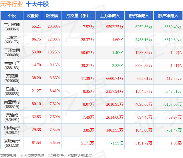 个股表现方面,元件行业当日领涨股为本川智能(300964),该股当日报收55.21,上涨20.0%,成交量7.52万,主力资金净流入9592.25万元。C超颖(603175)以上涨12.08%紧随其后,该股当日成交量28.37万,主力资金净流入1.6亿元。除此之外,三环集团(300408)、生益电子(688183)、万源通(920060)均进入当日牛股之列。具体个股列表见下表: