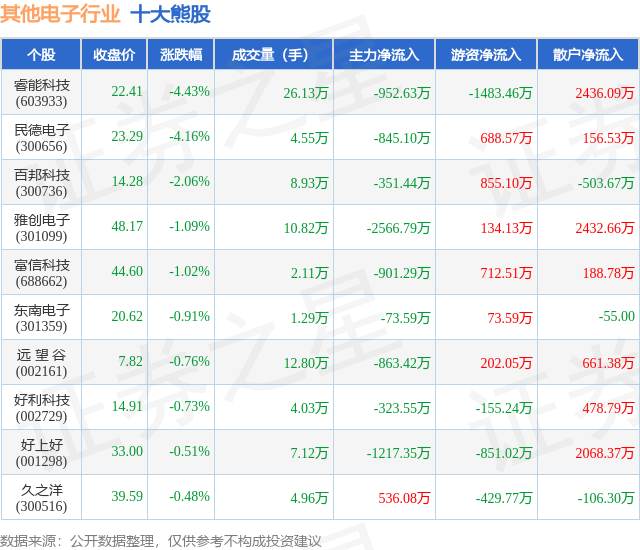 个股表现方面,其他电子行业当日领跌股为睿能科技(603933),该股当日报收22.41,下跌4.43%,成交量26.13万,主力资金净流出952.63万元。民德电子(300656)以下跌4.16%紧随其后,该股当日成交量4.55万,主力资金净流出845.1万元。除此之外,百邦科技(300736)、雅创电子(301099)、富信科技(688662)均进入当日熊股之列。具体个股列表见下表: