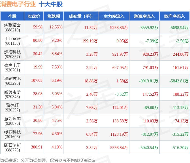 个股表现方面,消费电子行业当日领涨股为统联精密(688210),该股当日报收59.98,上涨12.55%,成交量11.52万,主力资金净流入9258.86万元。工业富联(601138)以上涨9.2%紧随其后,该股当日成交量199.19万,主力资金净流入9.95亿元。除此之外,泓禧科技(920857)、豪声电子(920701)、华勤技术(603296)均进入当日牛股之列。具体个股列表见下表: