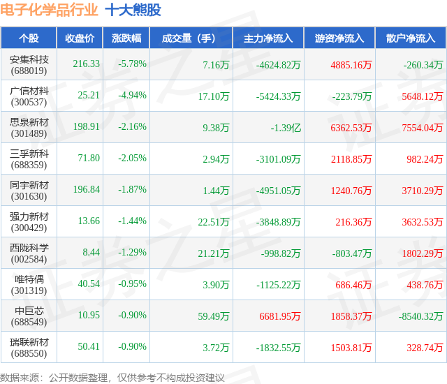 个股表现方面,电子化学品行业当日领跌股为安集科技(688019),该股当日报收216.33,下跌5.78%,成交量7.16万,主力资金净流出4624.82万元。广信材料(300537)以下跌4.94%紧随其后,该股当日成交量17.1万,主力资金净流出5424.33万元。除此之外,思泉新材(301489)、三孚新科(688359)、同宇新材(301630)均进入当日熊股之列。具体个股列表见下表: