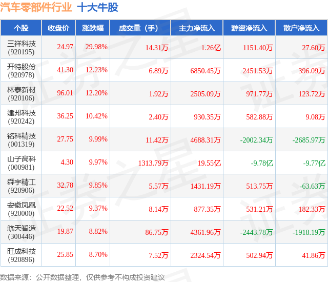 个股表现方面,汽车零部件行业当日领涨股为三祥科技(920195),该股当日报收24.97,上涨29.98%,成交量14.31万,主力资金净流入1.26亿元。开特股份(920978)以上涨12.23%紧随其后,该股当日成交量6.89万,主力资金净流入6850.45万元。除此之外,林泰新材(920106)、建邦科技(920242)、铭科精技(001319)均进入当日牛股之列。具体个股列表见下表:
